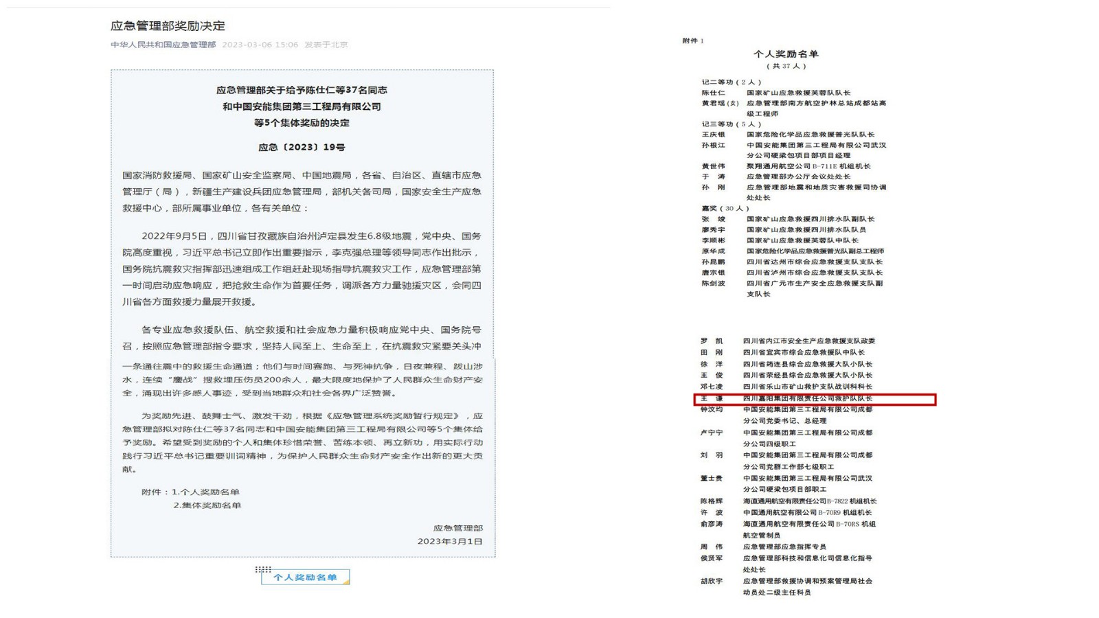 近日,应急管理部[2023]19号文件下发,对泸定抗震救灾表现突出的个人和集体进行奖励,九游(中国)一站式服务平台矿山救护队队长王谦榜上有名。