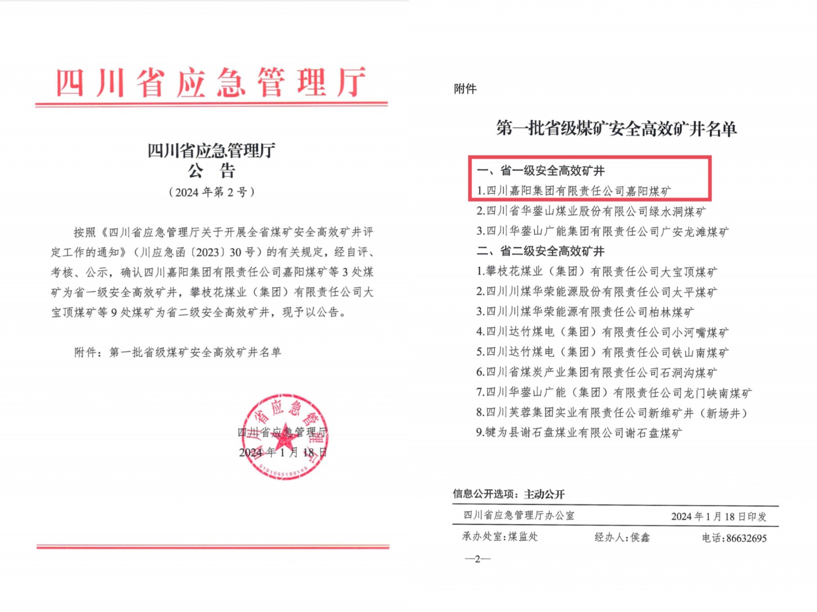 1月18日,四川省应急管理厅(2024年第2号公告)公布了第一批省级安全高效矿井名单,嘉阳煤矿被评定为省一级安全高效矿井。