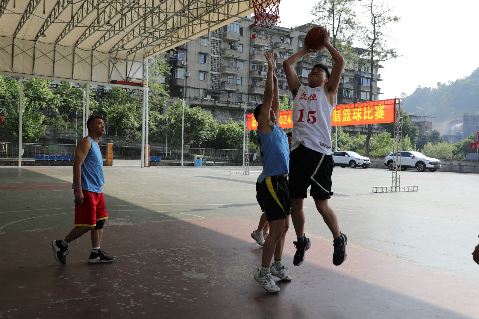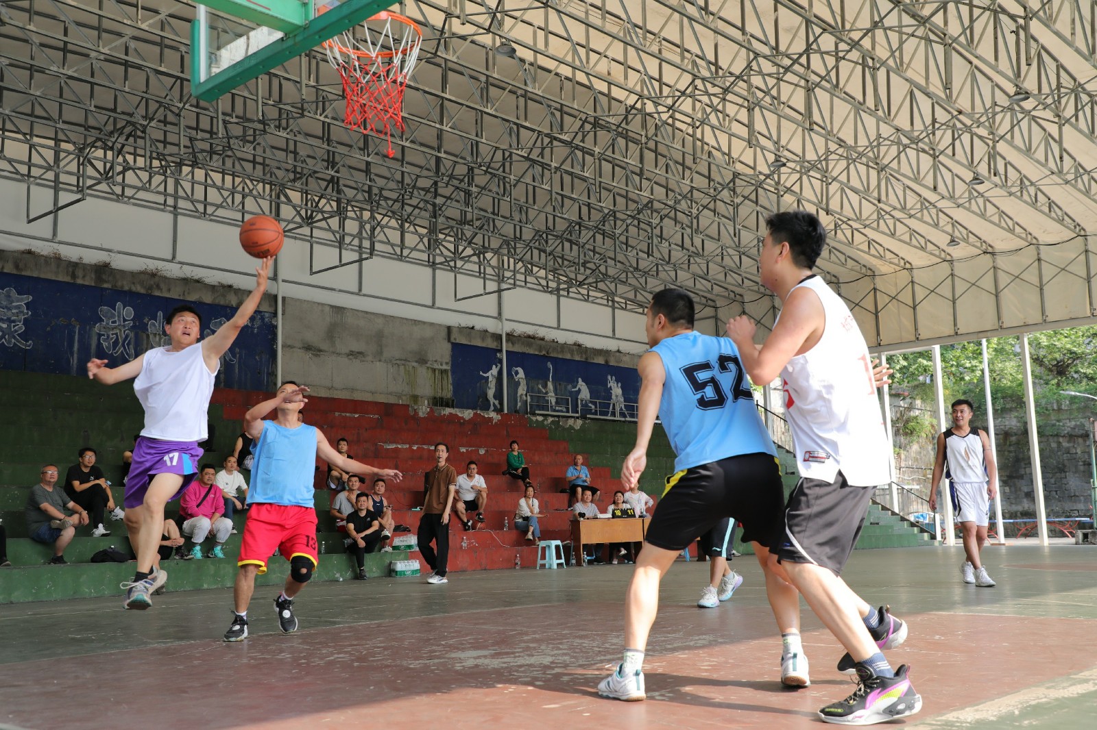 热爱无关年龄,有梦就有青春,首场对决是在机关四队与嘉阳煤矿代表队之间展开,这是场上“最萌年龄差”的两支代表队,两队平均年龄相差26岁。哨声响而动全身,双方迅速进入状态,篮球前辈们热情仍不减当年,技术娴熟、巧妙传球、完美配合;热血青年们纷纷开启“运动模式”,你争我夺、你攻我守。双方时而远距离投篮,时而近距离搏杀,都在争夺每一个球权。场上球员们挥汗如雨、奋勇拼搏、竞逐赛场,观众们加油助威呐喊声持续不断,现场氛围达到了高潮。