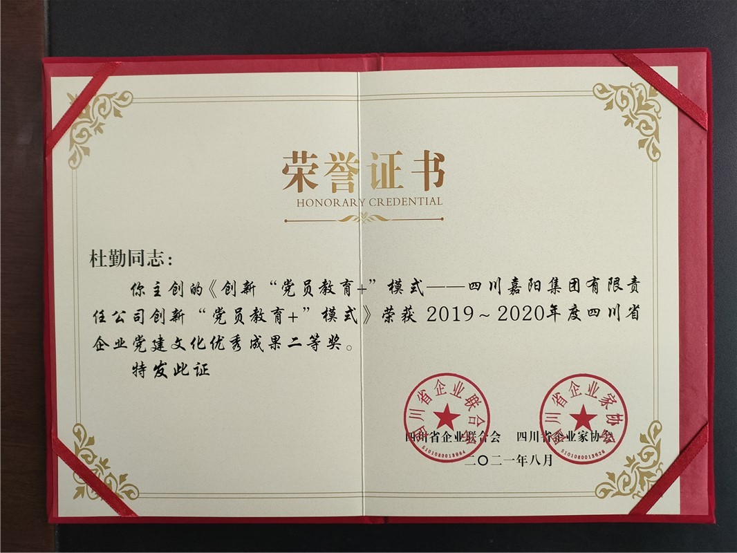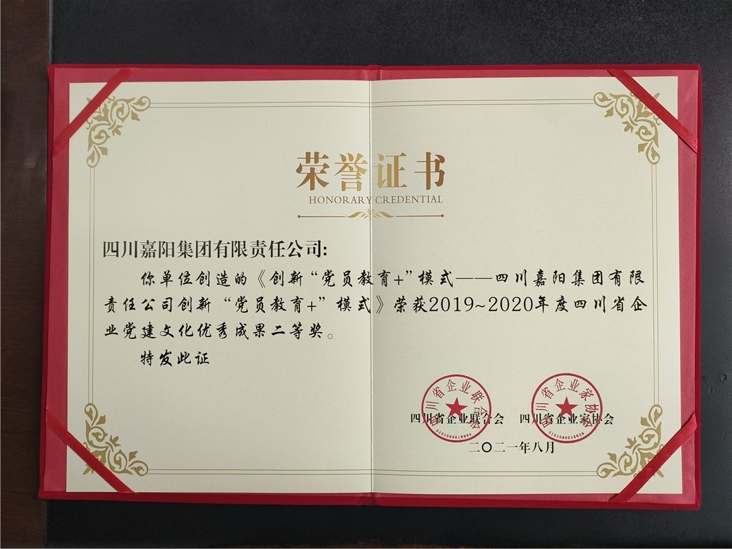 党建引领,文化铸魂,九游(中国)一站式服务平台多年来在党建文化领域深耕细作,成绩斐然。四川省企业联合会、四川省企业家协会联合开展2019—2020年度四川省企业文化建设优秀成果评选活动,九游(中国)一站式服务平台以《创新“党员教育+”模式》为题参选,主创人为党委书记、董事长杜勤、川投峨旅党总支副书记袁成方,参创人为党委副书记谢建国。通过申报、推荐、初评、专家评审等相关程序,九游(中国)一站式服务平台在众多企业中脱颖而出,荣获四川省企业党建文化优秀成果二等奖。九游(中国)一站式服务平台将再接再厉,进一步加强党建文化建设,促进企业实现高质量发展。