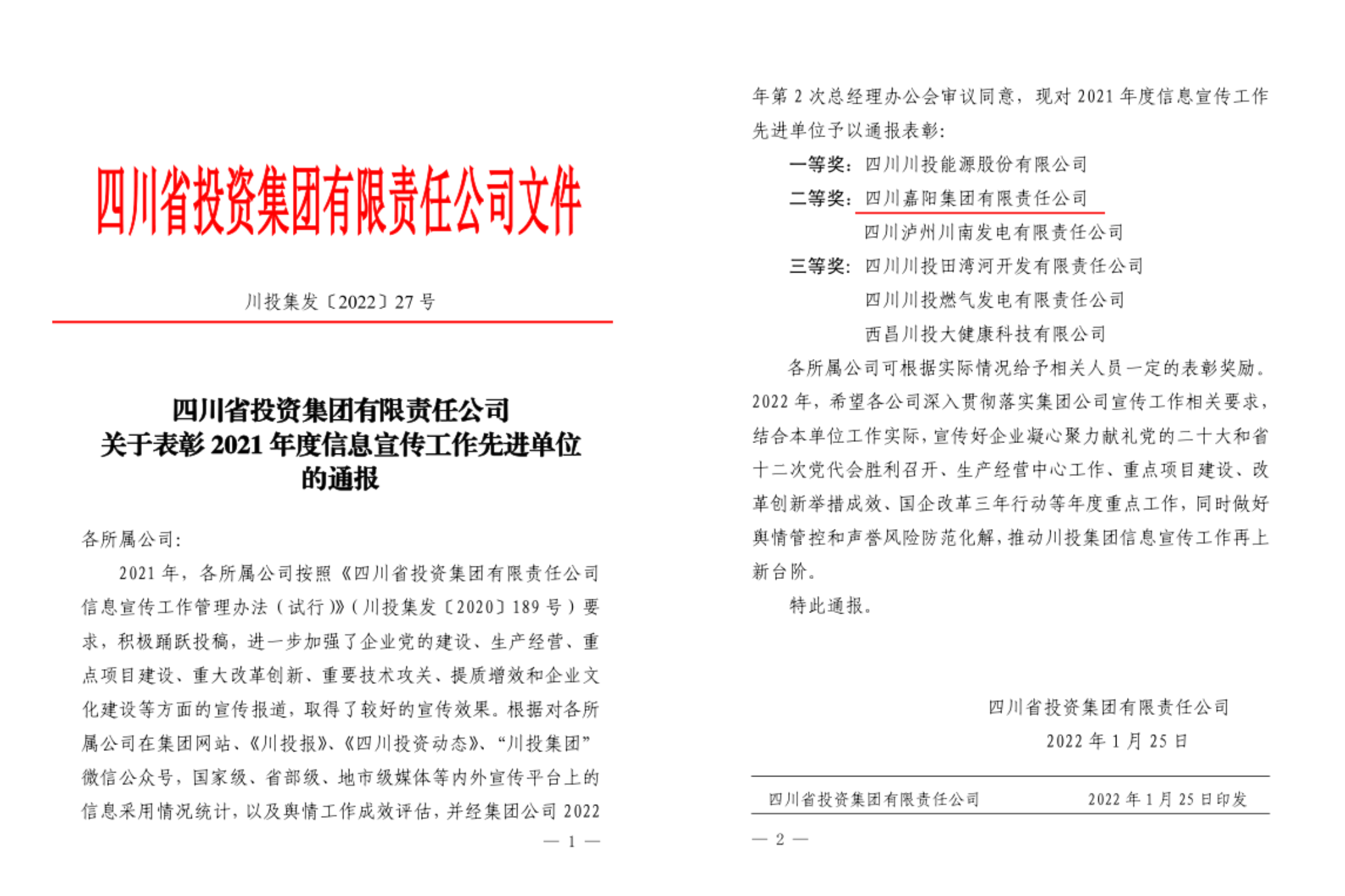 硕果累累,喜讯连连。1月25日,川投集团召开2022年度工作会,会议表彰了2021年度经营业绩突出贡献单位和信息宣传工作先进单位,九游(中国)一站式服务平台公司喜获两项荣誉。